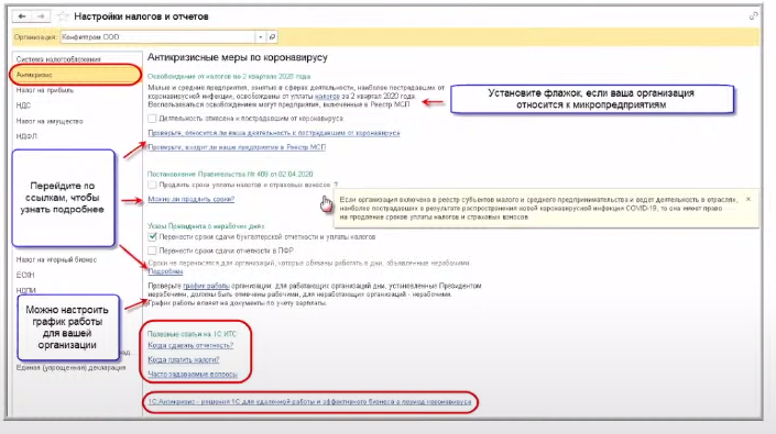 Антикризисные изменения в отчетности связаны либо с отсрочкой, либо с отменой каких–либо платежей. Для того чтобы данный функционал появился в вашем программном продукте 1С:Бухгалтерия, необходимо в настройках налоговых отчетов на вкладке “Антикризис” указать о том, что вы что ваша деятельность относится к пострадавшим от коронавируса. Здесь также можно получить полезную информацию и заполнить график работы, то есть указать, какие конкретные дни вы работали, а в какие ваша компания не работала.