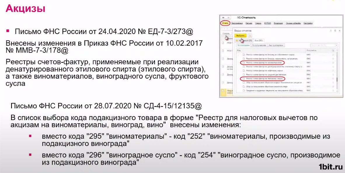 Также в соответствии с письмом ФНС России от 28 июля 2020 года в список выбора кода подакцизного товара в форме “Реестр налоговых вычетов” внесены изменения. Вместо кода “295” используется код “252”, вместо кода “296” используется код “294”. В программных продуктах данные изменения также реализованы.