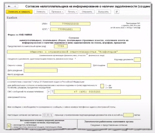 Также в соответствии с приказом ФНС России от 6 июля 2020 года утверждена форма согласия налогоплательщика на информирование о наличии недоимки или задолженности по пеням, штрафам, процентам (применяется с 1 декабря 2020 года).  В программном продукте данная форма уже реализована.
