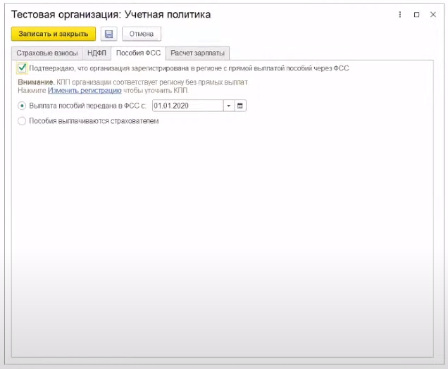 Для того чтобы в программном продукте больничные считались по новым правилам, необходимо в “Учетной политике организации”, поставить галочку, что вы подтверждаете, что организация зарегистрирована в регионе с прямой выплатой пособий ФСС. Также необходимо указать галку, если по адресу вашей организации вы должны участвовать в пилотном проекте, но у вас галка не включена. В таком случае при расчете больничного появится баннер о том, что организация зарегистрирована в регионе, где должен быть пилотный проект: программа порекомендует проверить настройки системы.