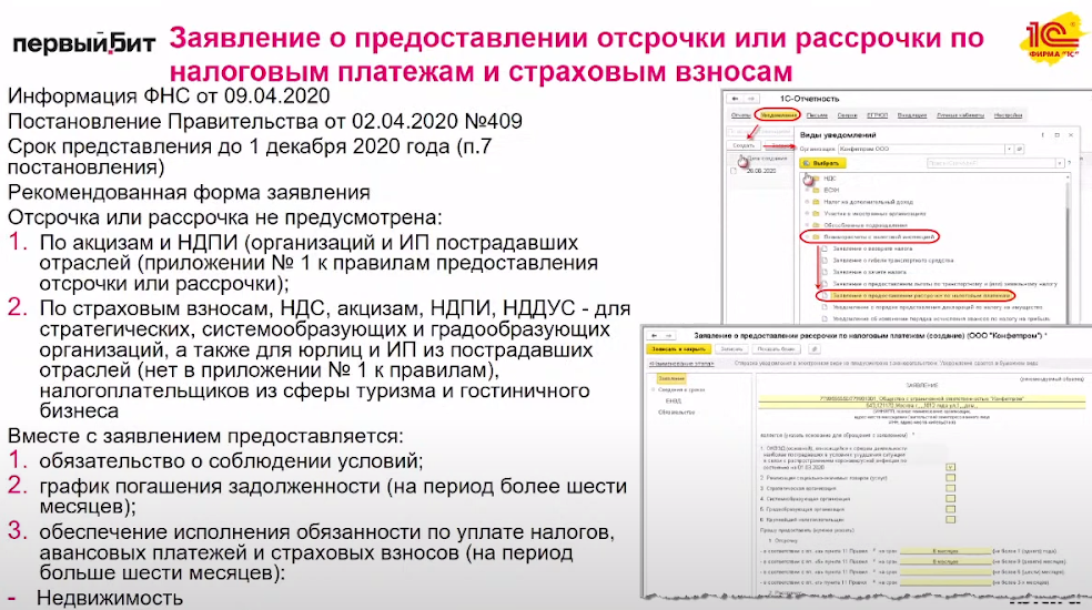 Для того чтобы воспользоваться отсрочкой в соответствии с постановлением Правительства от 2 апреля 2020 года, необходимо предоставить заявление о предоставлении отсрочки или рассрочки по налоговым платежам и страховым взносам. При этом такая рассрочка не предусмотрена по акцизам и налогу на добычу полезных ископаемых, для организаций, которые указаны в приложении №1 к правилам предоставления. По страховым взносам НДС, НДПИ, НДДУС не предусмотрена рассрочка для тех, кого нет приложении №1 к правилам. Это относится к стратегическим, системообразующим, градообразующим организациям.
