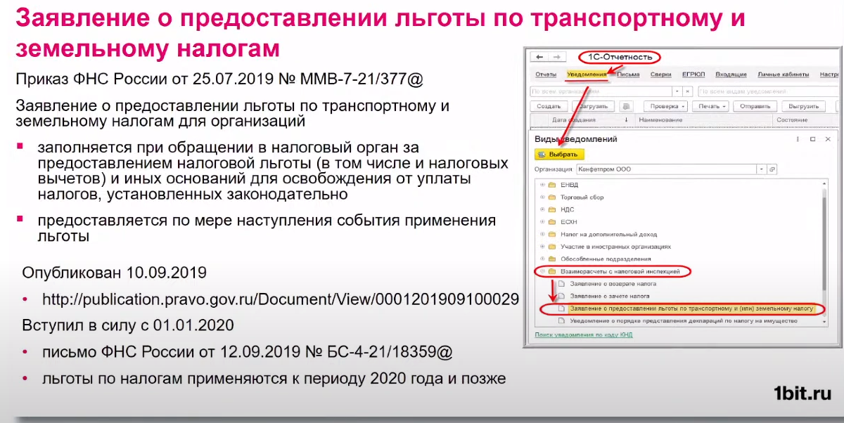 Такое заявление о предоставлении льготы по транспортному и земельному налогам вы можете сформировать из 1С: отчетности. Вступил приказ ФНС в силу с 1 января 2020 года. Льготы по налогам применяются к периоду 2020 года и позже.