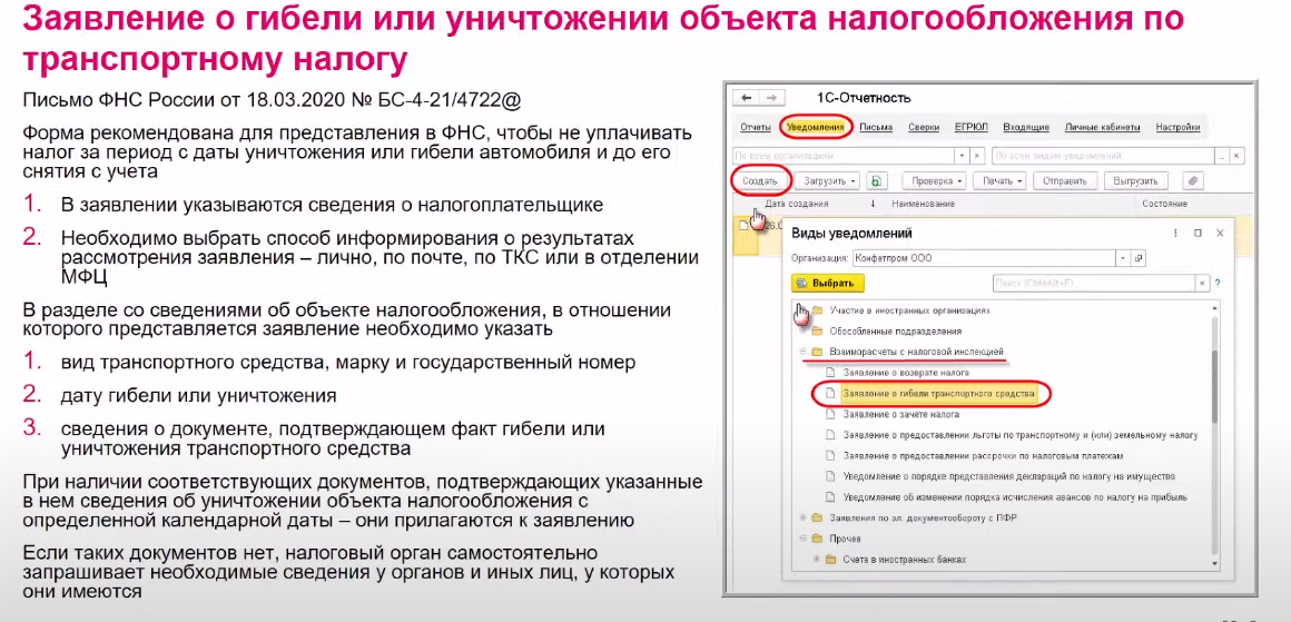 В соответствии с письмом ФНС России от 18 марта 2020 года рекомендована форма заявления о гибели транспортного средства. Подается она для того, чтобы не платить налог с периода, когда транспортное средство погибло до периода, когда оно было снято с учета.