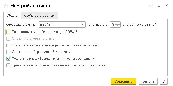 • "Общие", на которой можно управлять количеством знаков после запятой в суммовых показателях, автоматической нумерацией страниц в документе, автоматическим расчетом показателей в вычисляемых ячейках, порядком заполнения полей при выборе из конкретного набора значений, расшифровкой автоматически заполненных показателей, проверкой соотношения показателей, использованием штрихкода PDF417 для печати документа;