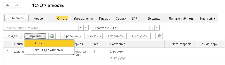 Работать с загруженным отчетом можно так же, как и с документом, непосредственно созданным в программе 1С: Бухгалтерия - корректировать, проверять, выгружать, отправлять через сервис 1С: Отчетность.