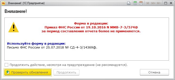 Законодательство России в части формирования и представления регламентированной отчетности достаточно часто изменяется. В программе 1С: Бухгалтерия есть специальный сервис оповещений, на основании которого производится контроль актуальности используемых форм отчетов и форматов выгрузки. Сервис также в автоматическом режиме блокирует устаревший отчет либо полностью, либо по его отдельным функциям, например, печать, выгрузку или отправку.