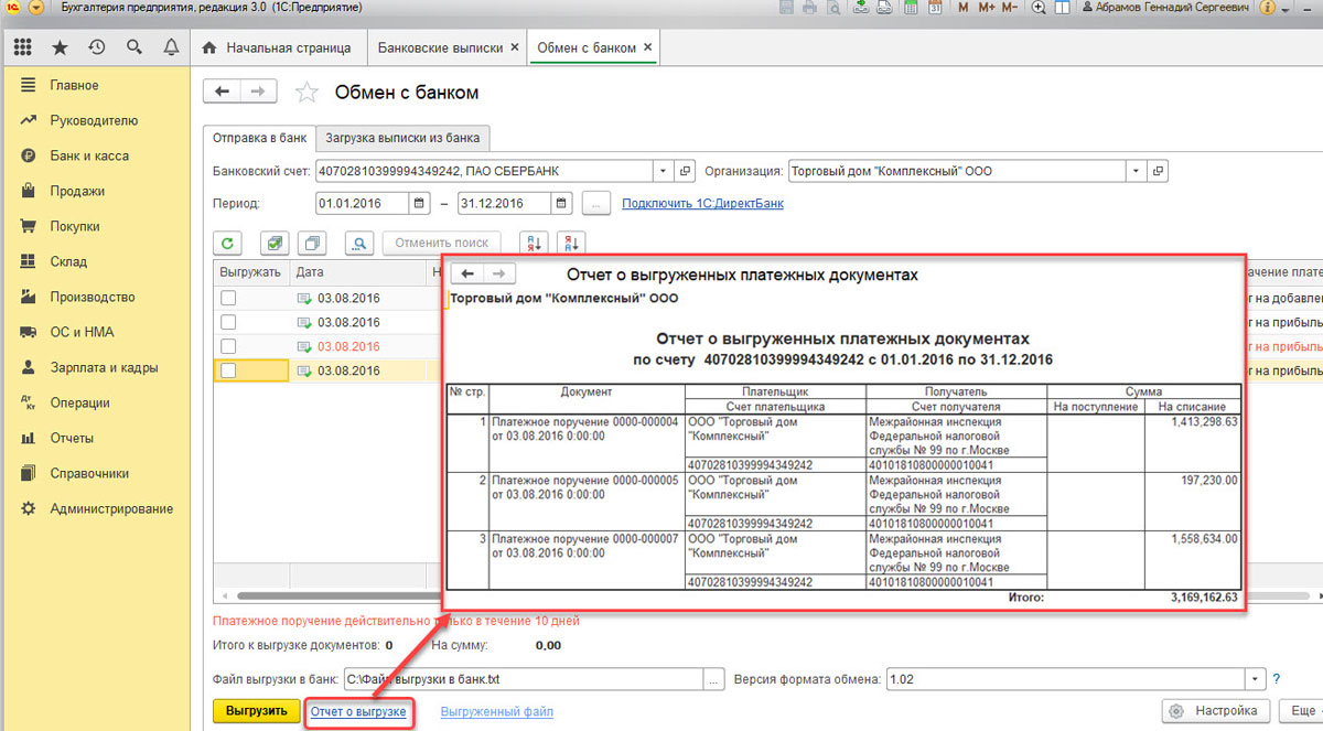 На этом этапе сформируется файл формата «1С_to_kl.txt». Его необходимо загрузить в банк-клиент. Отчет о выгруженных платежных документах отражается в окне «Обмен с банком». Далее необходимо выбрать «Отчет о выгрузке». Отчет будет содержать платежки, выгруженные в файл для последующей загрузки в «банк-клиент». Доступна опция печати или сохранения в любом формате.