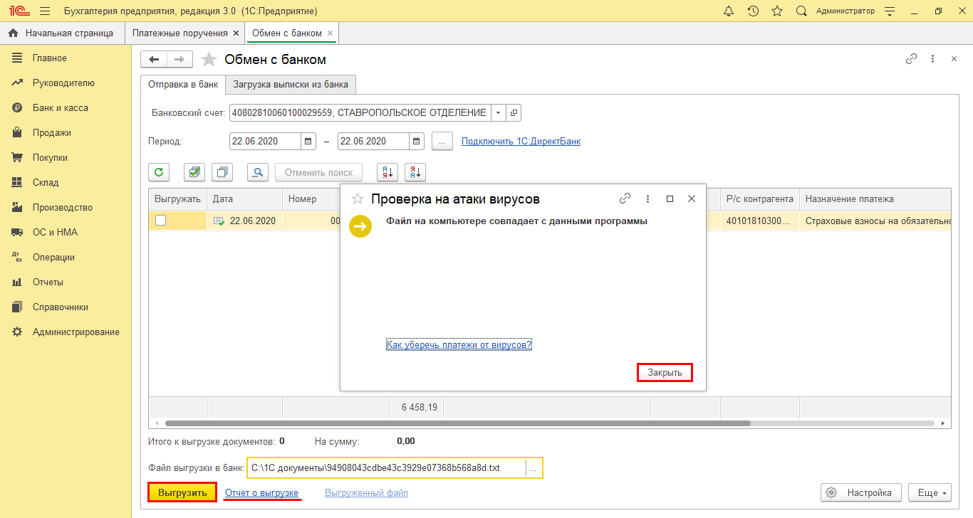 В табличной части отобразятся платежки, которые необходимо оплатить. Напротив каждого документа проставляется «Флаг», затем следует кликнуть на «Выгрузить». Далее откроется окно «Проверка на атаки вируса». После чего необходимо нажать на «Проверить».