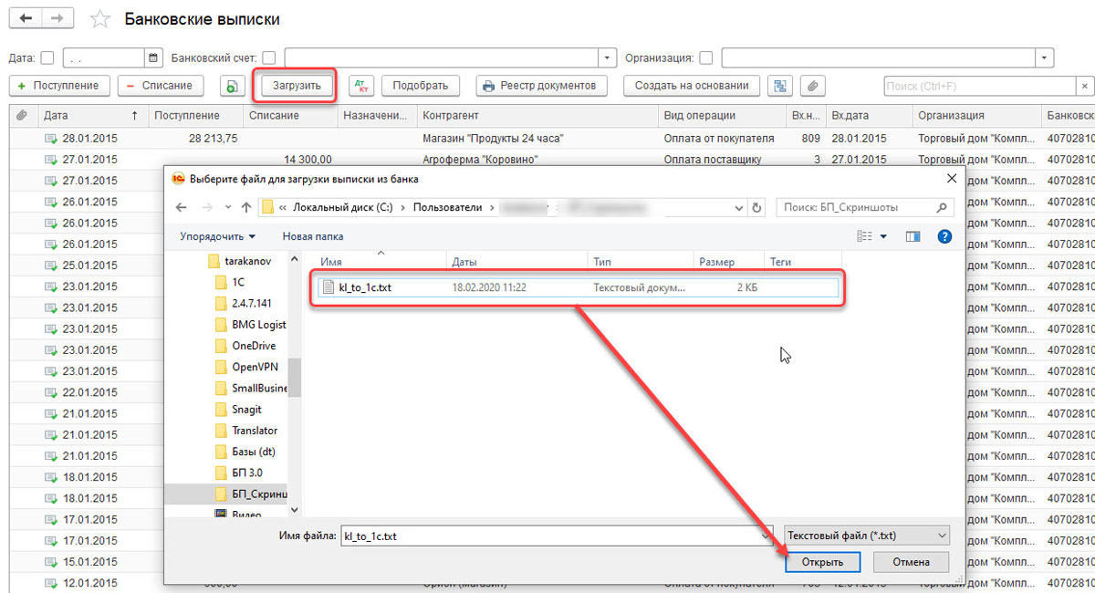 Здесь можно найти файл загрузки выписки и нажать на «Открыть».