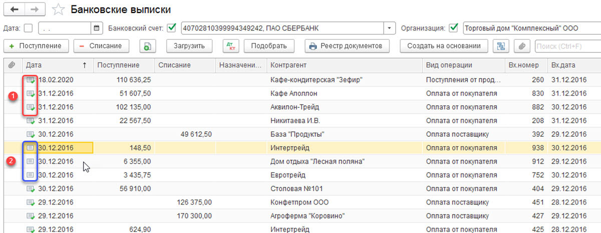 - задать список по конкретной организации, контрагенту, дате или банковскому счету.