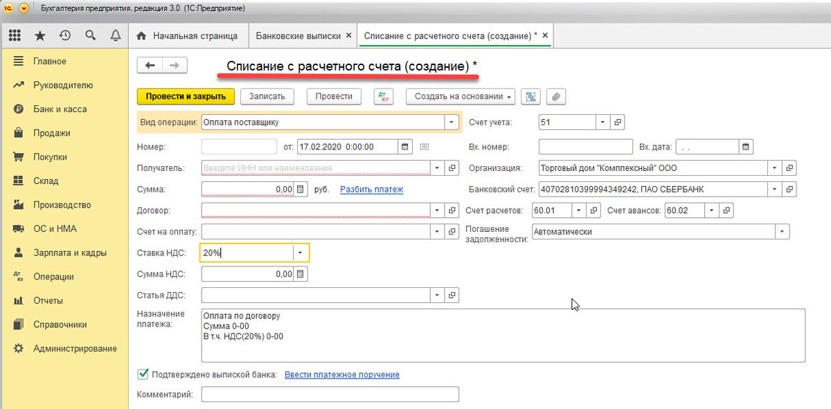 Для формирования проводок потребуется создать документ «Списание с р/сч». Сделать это можно вручную или на основе платежки.