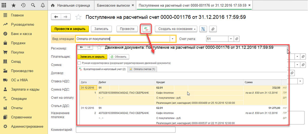 Корректность заполненных данных можно проверить с помощью «Записать-Провести». Через кнопку «ДтКт» проверяется корректность отображения проводок в документах «Поступление на расчетный счет» и «Списание с расчетного счета». После нажатия кнопки откроется окно «Движение документа».