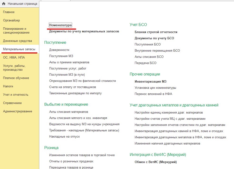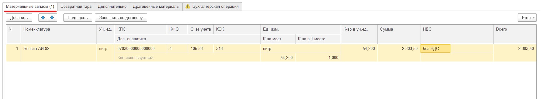 После чего на закладке "Материальные запасы" требуется обозначить сведения о поступившем топливе. Подобрать из справочника номенклатуру, указать коды классификации. При подборе номенклатуры КЭК и счет учета проставляются автоматически. Если необходимо, эти сведения можно в документации исправить. Дальше обозначается сумма и количество бензина.