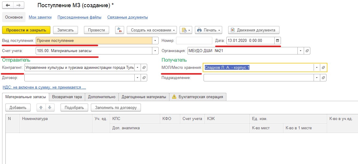 Далее нужно выбрать в шапке документа "Прочее поступление", счет учета 105. Заполнить дату, из справочника выбрать отправителя и получателя.
