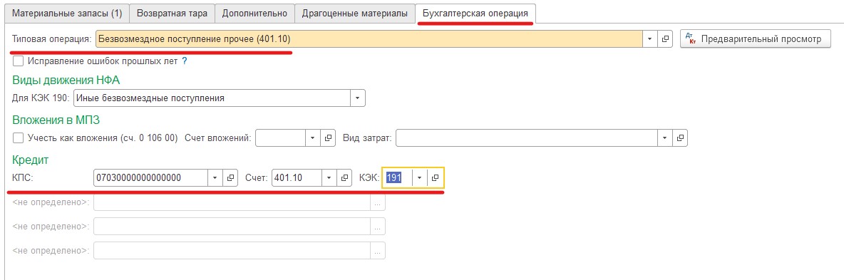 Выбирается закладка "Бухгалтерская операция". Именно, операция –"Безвозмездное поступление прочее (401.10)". Указываются для данной операции КЭК и КПС счета кредита. Определяется КЭК с учетом того, от кого произошло поступление. В данном примере 191-Безвозмездные неденежные текущие поступления от сектора госуправления и организаций госсектора.