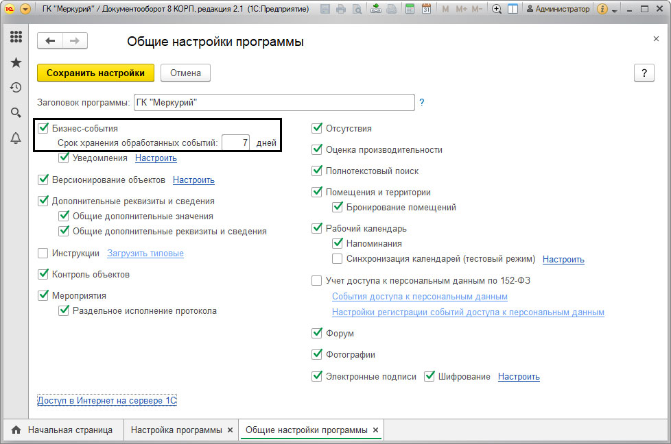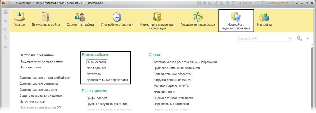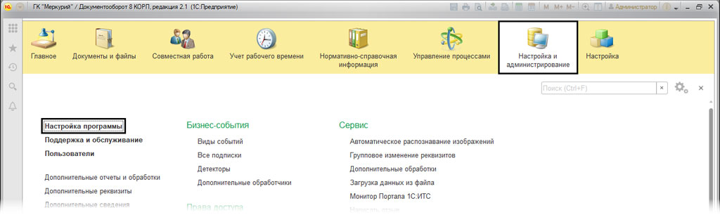 Чтобы иметь возможность использовать механизм бизнес-событий, необходимо в настройках программы выбрать соответствующую опцию. Для этого нужно зайти в «Настройки программы» и выбрать там раздел «Настройка и администрирование».