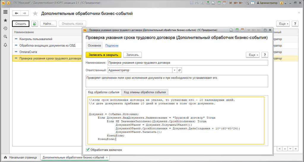В открывшемся окне необходимо указать наименование обработчика, код для обработки события, после чего необходимо установить галочку «Обработчик включен».