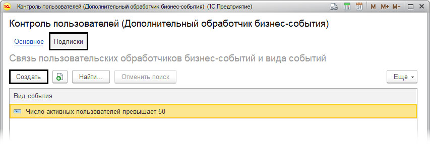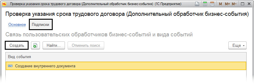 После чего в меню «Подписки» нужно указать подписку для вновь созданного дополнительного обработчик (кнопка «Создать»).