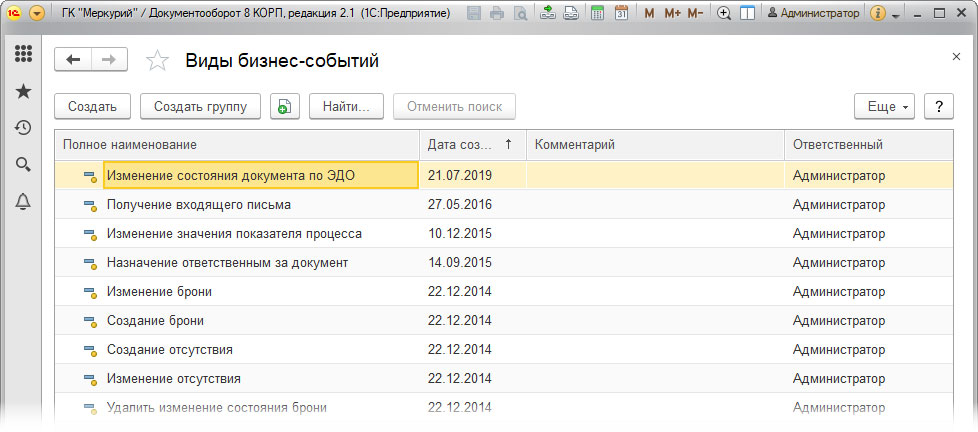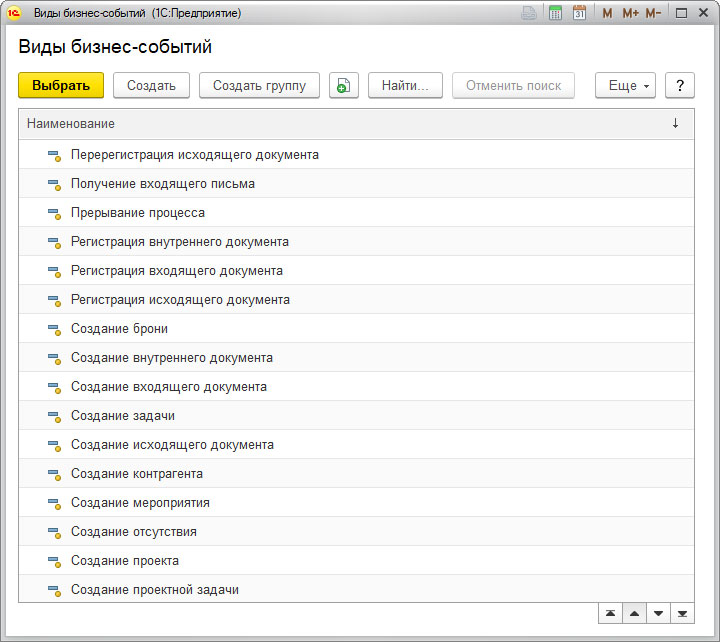 Если пройти в раздел «Настройка и администрирование» и далее в меню «Бизнес-события», то откроется справочник «Виды бизнес событий».