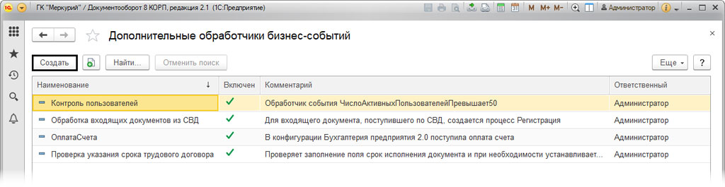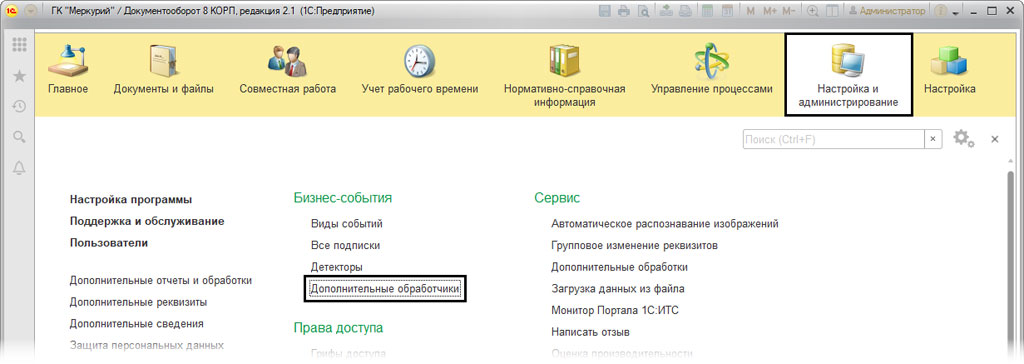 Функционал системы позволяет пользователю создавать собственные бизнес-события и назначить им обработчик событий и как типовые, так и созданные пользователем. Для того, чтобы создать дополнительное событие, необходимо последовательно открыть: «Настройка и администрирование», потом «Бизнес-события» и там выбрать «Дополнительные обработчики».