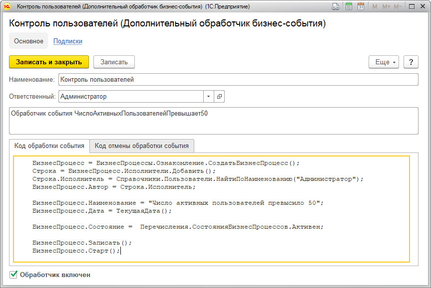 В открывшемся окне необходимо указать наименование обработчика, код для обработки события, после чего необходимо установить галочку «Обработчик включен».