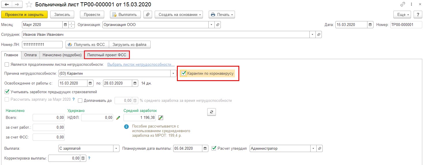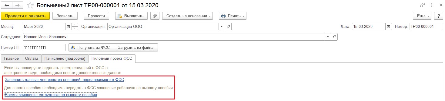 • В Постановлении Правительства РФ №294 сказано, что такие листки нетрудоспособности оплачиваются ФСС напрямую, как при пилотном проекте. Поэтому на вкладке «Начислено (подробно)» отсутствует рассчитанная сумма, причитающаяся сотруднику.