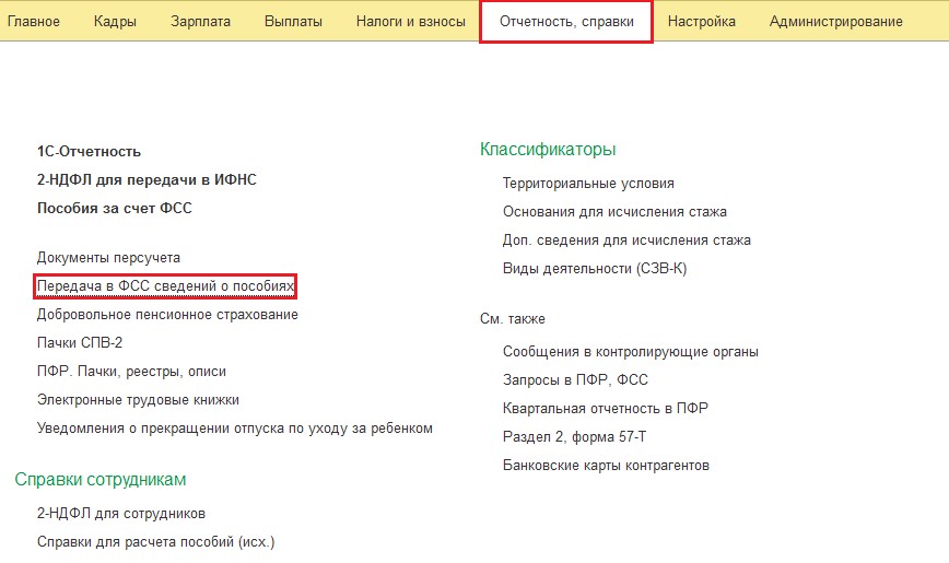 Далее переходим в раздел «Отчётность, справки» и выбираем пункт «Передача в ФСС сведений о пособиях».