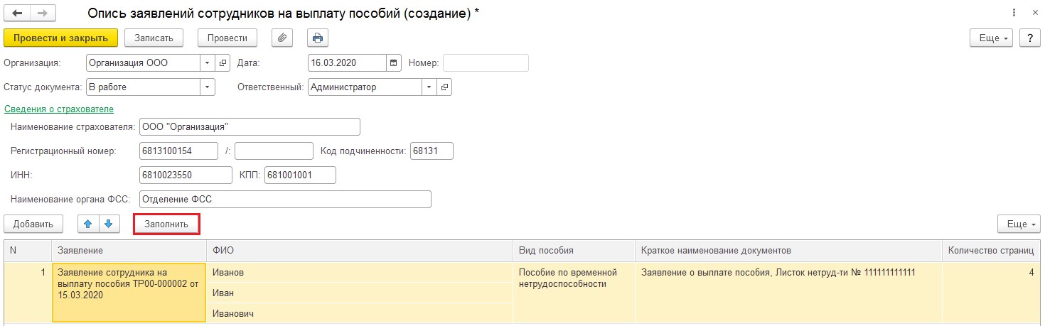 Заполняется оно автоматически всеми заявлениями, которые были введены и не переданы в ФСС при нажатии на кнопку «Заполнить».