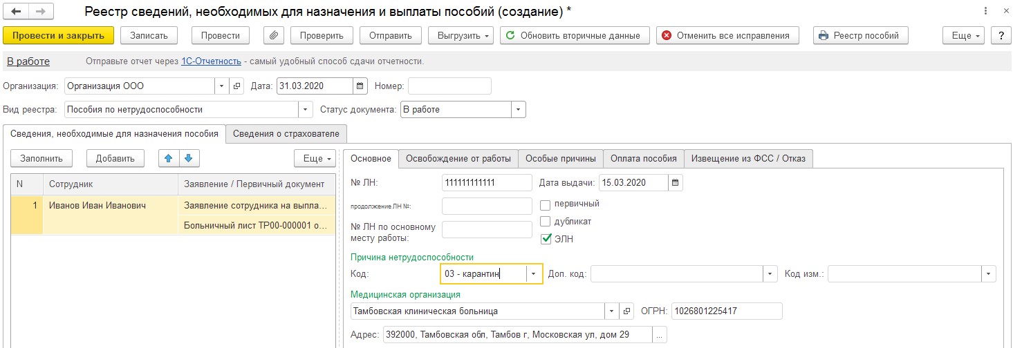 • После загрузки данных больничного листа поле «Причина нетрудоспособности» будет заполнено автоматически кодом 03 – карантин. Если данный карантин связан с короновирусом, то флаг «Карантин по короновирусу» нужно установить вручную;