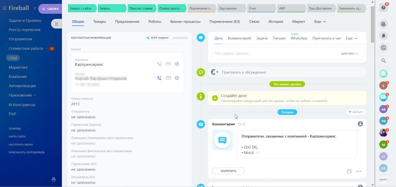 До автоматизации в компании отсутствовал централизованный реестр перевозчиков, что время от времени приводило к потерям данных и затрудняло контроль качества обслуживания. Также сотрудники испытывали неудобства в электронной комплектации грузов: чтобы заполнить транспортное средство, сделки приходилось объединять вручную, что значительно снижало скорость логистики. Нумерация сделок сотрудниками также производилась самостоятельно, что усложняло учёт грузов. Кроме того, компании не хватало системы формирования отчётов, которая позволяла бы получить детализированную аналитику по сделкам и взаимодействиям с перевозчиками. С запросом на качественные IT-перемены дирекция Fireball обратилась в костанайский офис «Первого Бита».