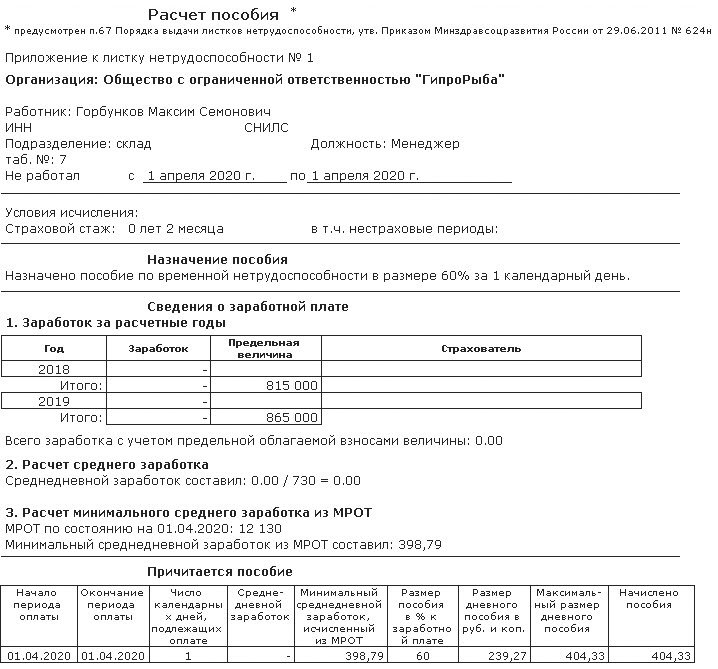 • В результате сотруднику будет назначено пособие по больничному листу в размере 404,33 рубля (рисунок 1).
