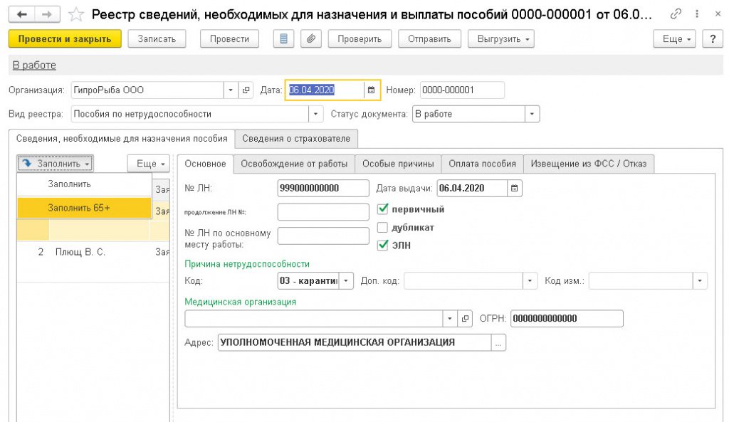 В реестр будут внесены сотрудники, родившиеся до 07.04.1955, автоматически и в полном соответствии с требованиями, предъявляемыми ФСС. Из данного реестра будут исключены сотрудники, которые в период с 6 по 19 апреля или с 20 по 30 апреля находились в отпуске, были на больничном или использовали дополнительные выходные дни. Кроме того, в этот реестр не буду включены лица, незастрахованные в ФСС. Если период отсутствия работника совпадает с началом или окончание периода с 6 по 19 апреля, под больничный отводится остаток периода (об этом программа сгенерирует соответствующее предупреждение). Если период отсутствия на работе частично перекрывает период карантина, введенного в связи с пандемией COVID-19, за оплачиваемый период будет принят наибольший из остатков периода.