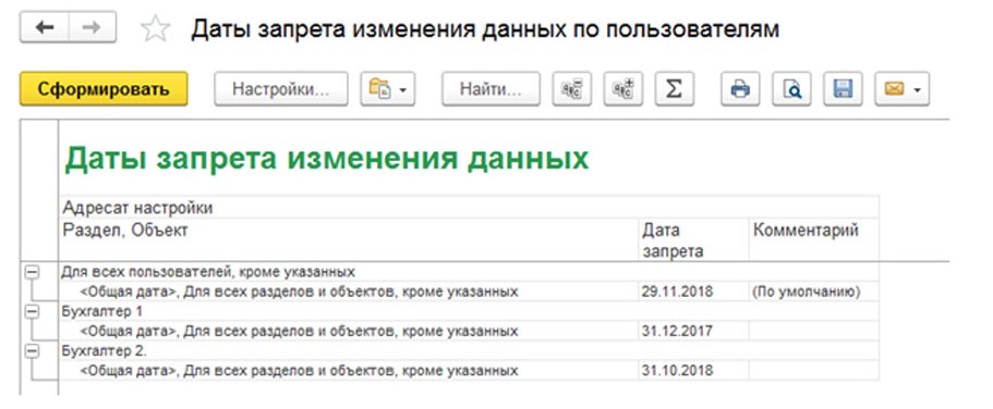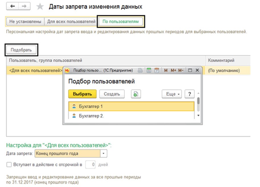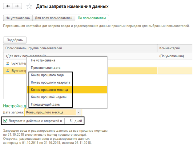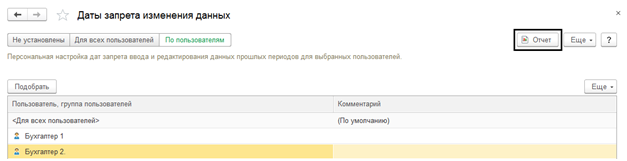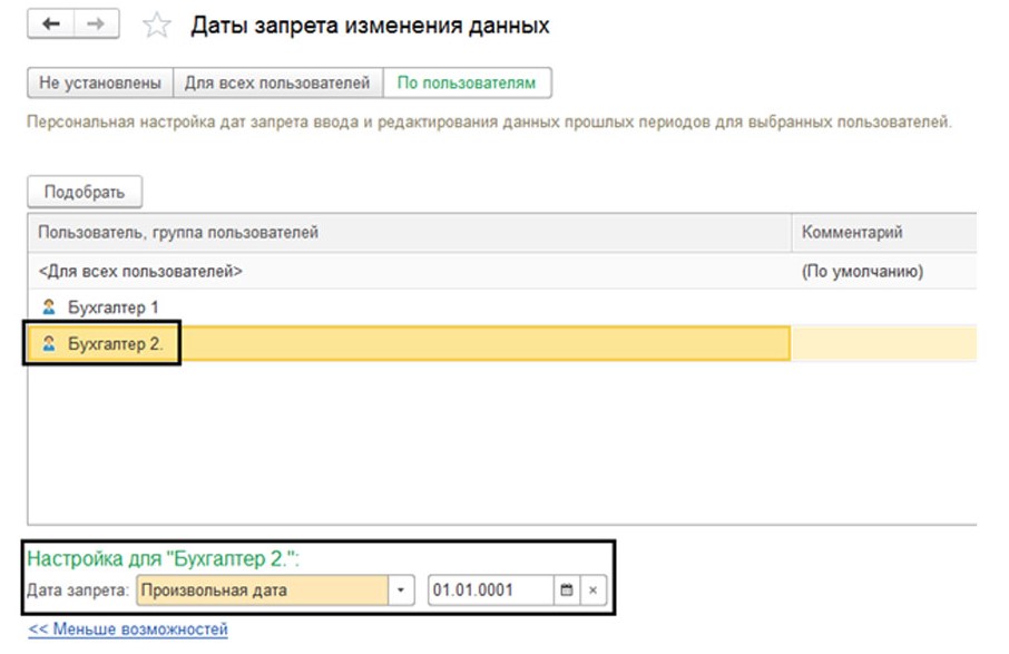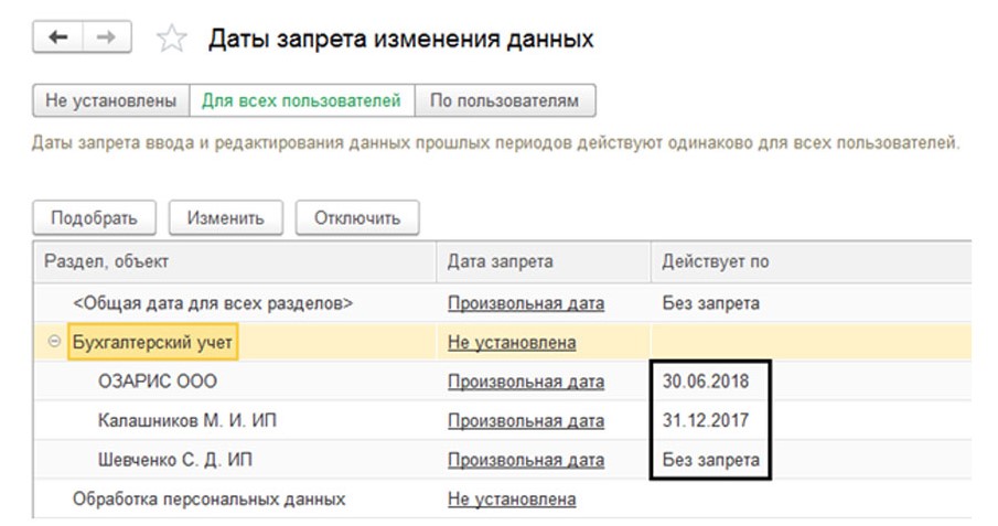 В примере рассматривается ситуация, когда для Бухгалтер 1 и Бухгалтер 2 были подобраны даты запрета, а для остальных сотрудников компании настройки остались прежними.