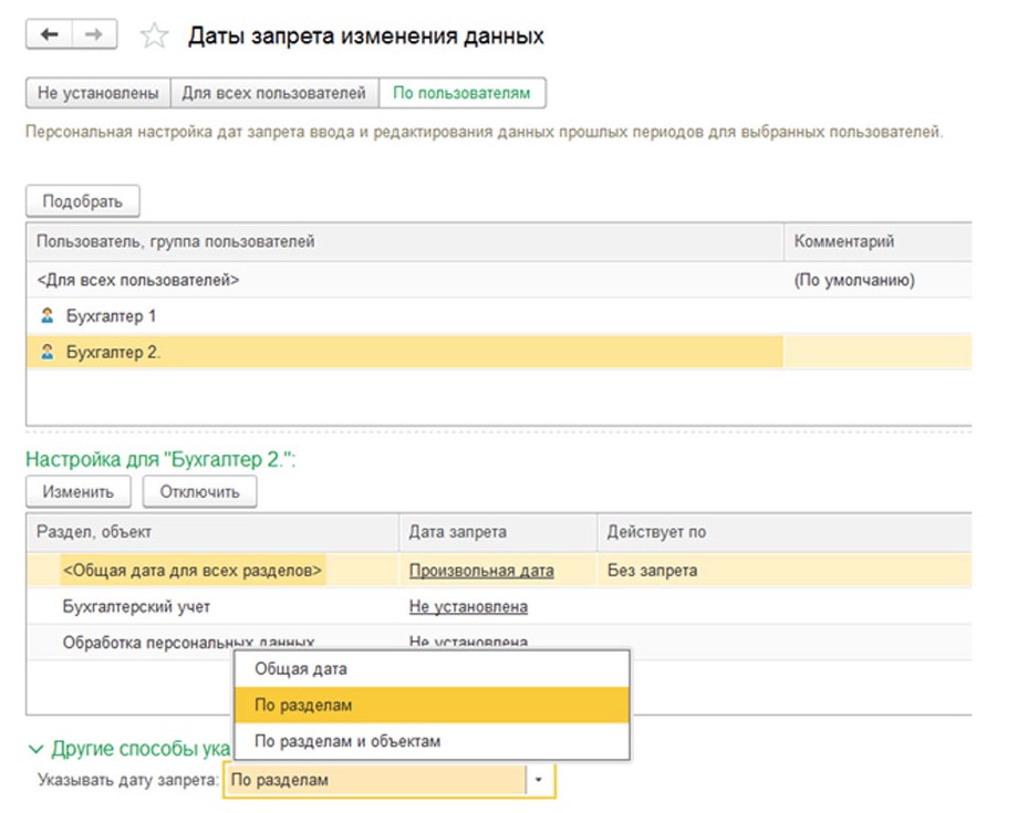 При выборе опции «Указывать дату запрета: «По разделам», откроется настройка разделов учета, в которых можно установить запрет на раздел «Бухучет» или на «Обработку персональных данных».