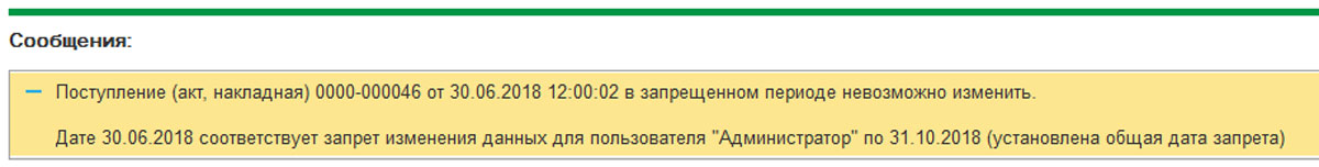 Установленный запрет не позволит внести изменения в документы, которые были введены раньше этой даты. При попытках сохранения или создания документа, который был создан ранее указанной даты, система оповестит вас об ошибке.