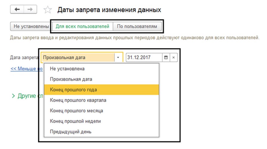 Важно знать, что при выставлении даты запрета, система предлагает выбрать - конец прошлого года, квартала, месяца, недели или установить дату запрета на предыдущий день. В подобной ситуации программа автоматически подберет эту дату. Этими значениями можно воспользоваться в общей настройке и индивидуальной.