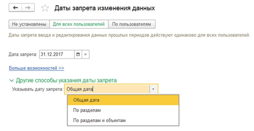 В этом же окне (запрет для всех), зайдя в другие возможные способы указания даты, можно задать дополнительные настройки даты по разделам учета и по объектам учета (организациям).