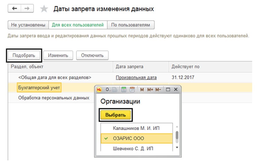 Если вы выбрали способ настройки по разделам или объектам, то вам необходимо выбрать раздел и с помощью кнопки «Подобрать» выбрать организацию, по отношению к которой будет установлена дата, из появившегося окна. Так мы разделили «Дату запрета» между компаниями. Этот метод можно использовать, если пользователям одной компании нужен доступ к документам, хотя пользователи другой компании уже отправили все отчеты и данные уже запрещено изменять.