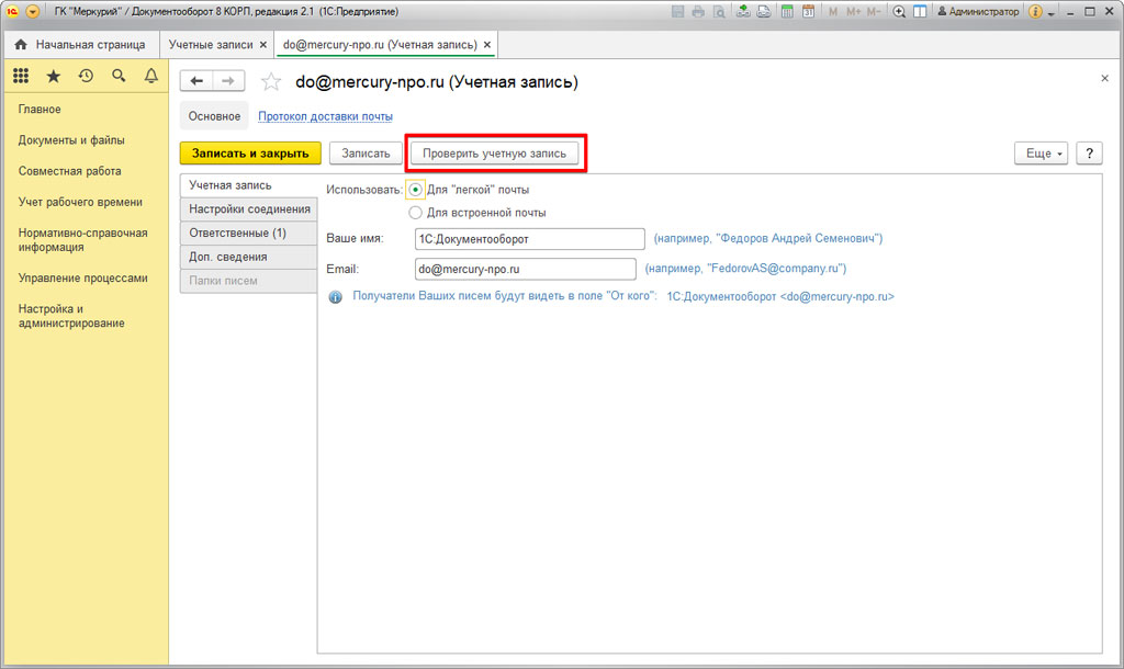 После выполнения всех настроек необходимо выполнить сохранение учетной записи, а также проверить корректность всех выполненных настроек (кнопка «Проверить учетную запись»).