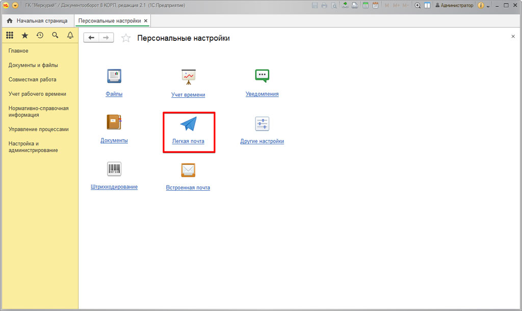 Далее следует перейти в раздел «Персональные настройки» и выбрать пункт «Легкая почта».