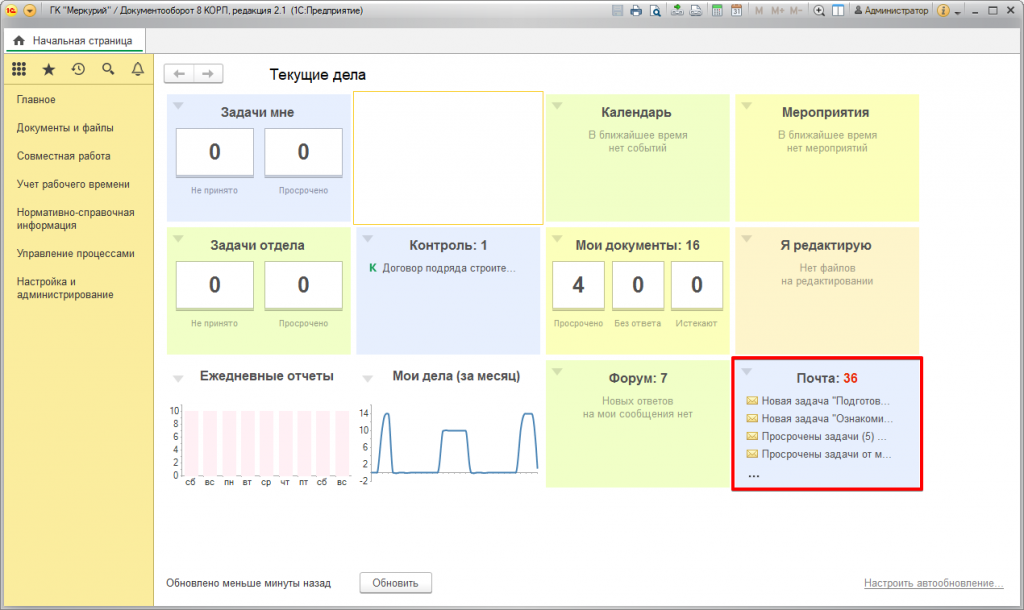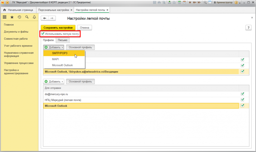 Настройка встроенной почты в 1С:Документооборот 8 КОРП