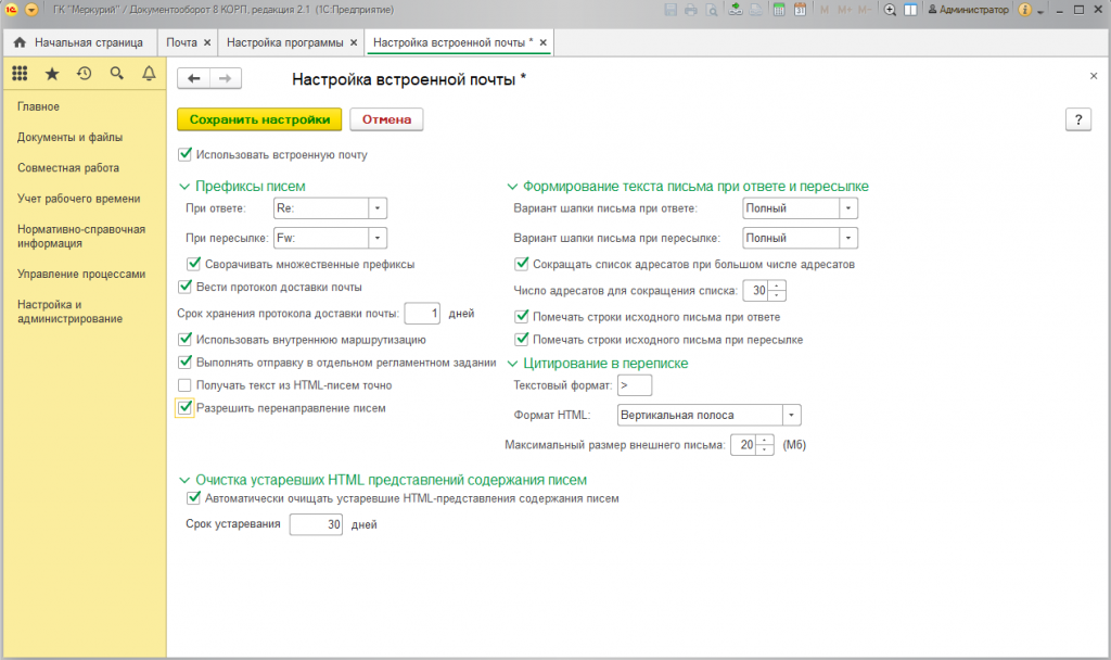 Как видно, 1С:Документооборот 8 КОРП позволяет пользователям задавать множество различных настроек для встроенной системной почты.