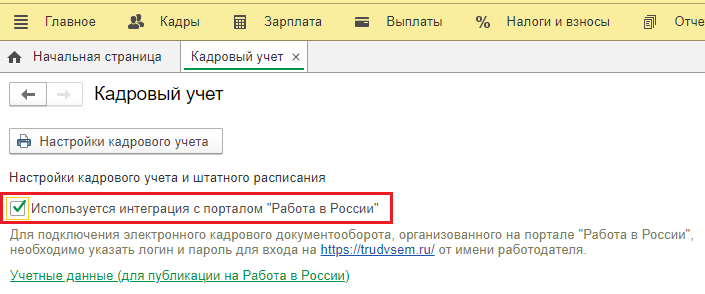 Для начала работы с кадровым электронным документооборотом нужно поставить флажок «Используется интеграция с порталом «Работа в России». Для этого пользователь заходит в меню «Настройки» и переходит в раздел «Кадровый учет».