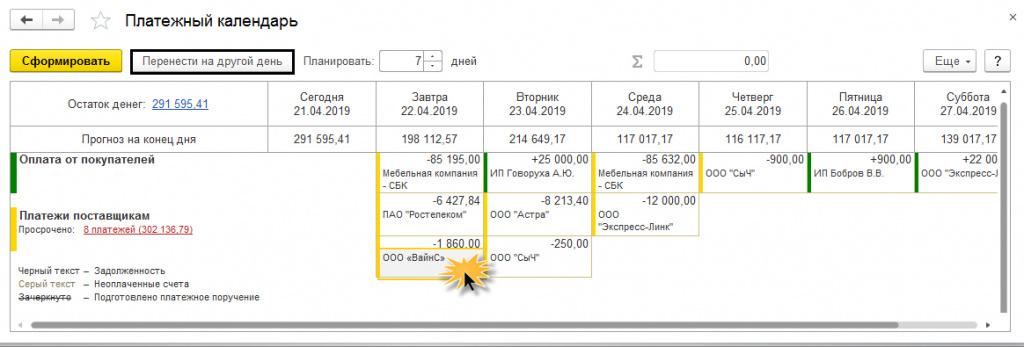Непосредственно в «Платежном календаре» можно перейти к первичному документу (накладные, акты работ и т.п.). Для этого нужно дважды щелкнуть на ячейке с интересующей суммой. Существует опция переноса даты платежа. Для этого необходимо выделить ячейку и выбрать «Перенести на другую дату».