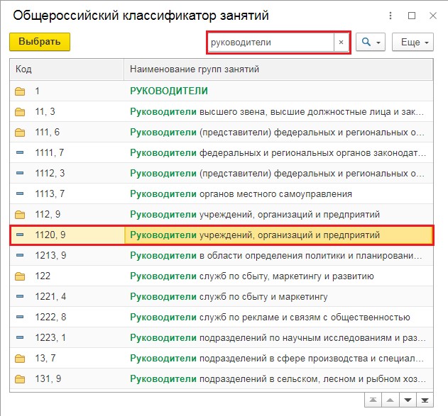 Например, определяем ОКЗ для должности «Директор». Отмечаем в поиске «Руководители» и выбираем значение из открывшегося списка.