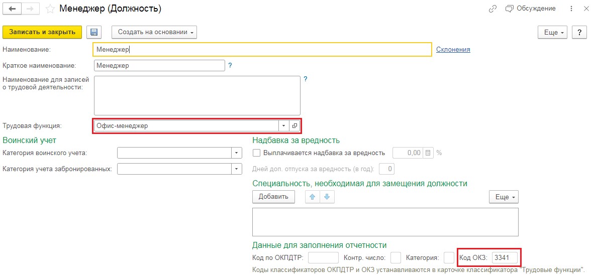 В программе 1С: Бухгалтерия предприятия код выполняемой функции надлежит заполнять в справочнике «Должности» раздела «Зарплата и кадры».