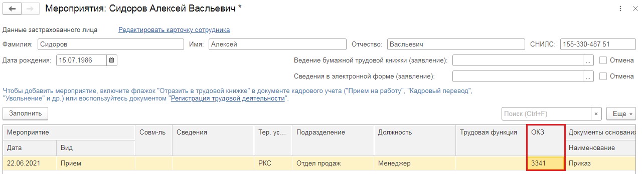 Для правильного заполнения кода необходимо заполнение строки «Трудовая функция». Это заполнение аналогично описанному выше в программе 1С: Бухгалтерия предприятия.