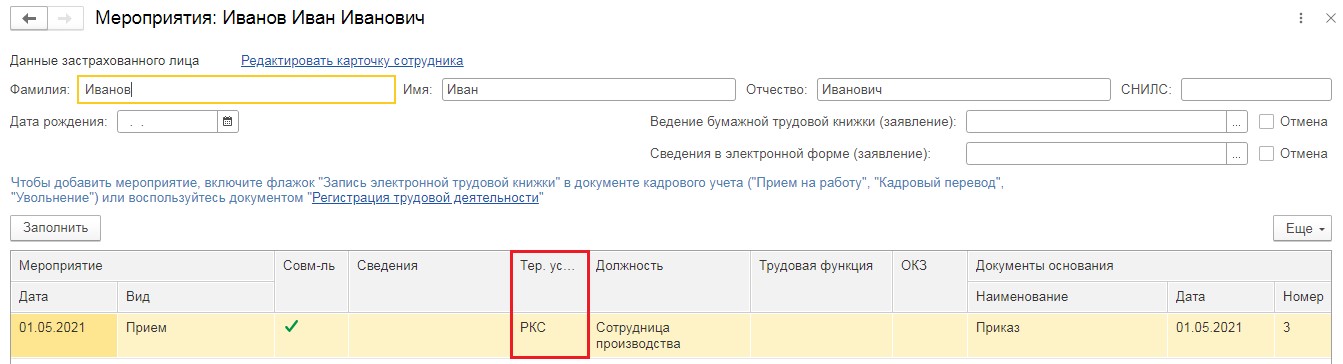 В открывшемся окне с помощью кнопки «Создать» из появившегося перечня выбираем «Сведения о трудовой деятельности работников, СЗВ-ТД» и заполняем появившуюся форму с помощью кнопки «Заполнить». Двойной клик по строке с фамилией сотрудника покажет существующие территориальные условия, которые будут отражены в печатной форме общей отчетности.