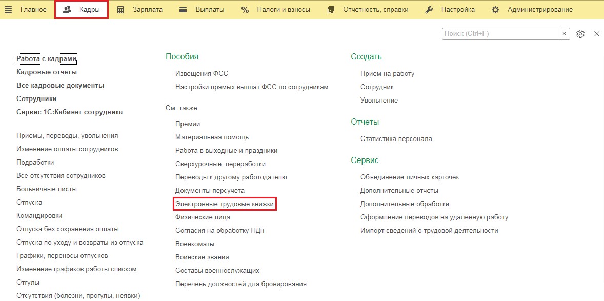 С принятием на работу нового сотрудника в данное подразделение создает отчет СЗВ-ТД, для чего откроем раздел «Кадры» и строку «Электронные трудовые книжки».