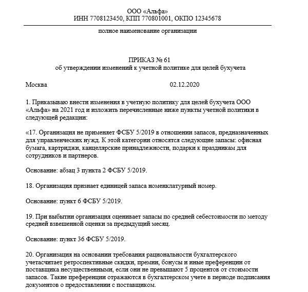 Образец приказа о внесении изменений в учетную политику для целей бухучета на 2021 г. в части ФСБУ 5/2019 «Запасы»